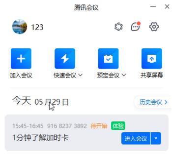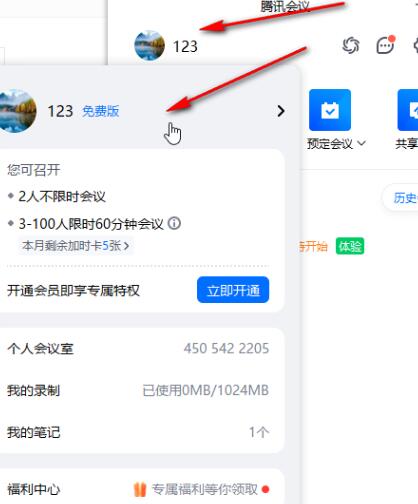 第一步:双击打开腾讯会议进入首页,可以看到当前是登录的状态,可以在界面左上方看到自己的账号和头像;