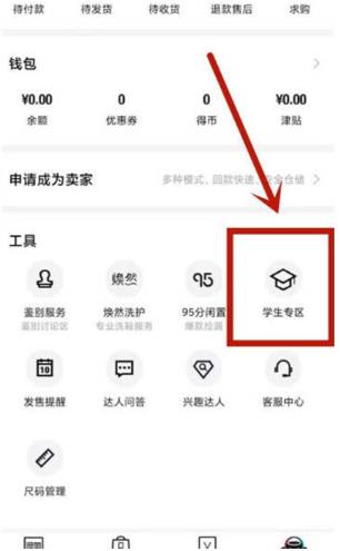我们打开得物软件,然后我们点击右下角我的,再点击上面的学生专区功能。