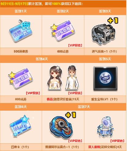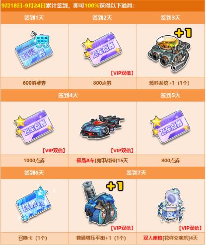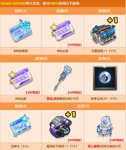 9月4日起,每天登录游戏完成签到,即可获得丰厚的点券奖励——VIP最高可达15200点券、人气道具【召唤卡】、极品【琦思灵轩套装】、极品A车【魔甲战神】和极品双人座椅【花样交响乐】等福利!