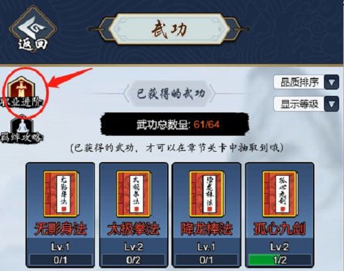 4.首页点击左下角【武功】,进入【武功】页面后点击左上角的【职业进阶】按钮则可进行查看。