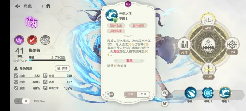 梅尔虽然伤害不高,但拥有强力的控制,配合鸟菲很可能一套带走对面,属于前期必备,后期看情况的角色。