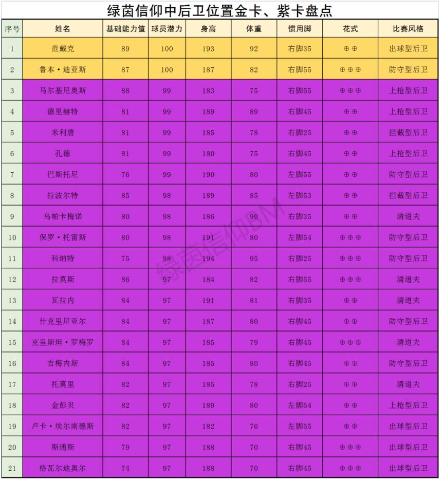 游戏中金卡中后卫2名,分别是在各自球队大放异彩且收获英超最佳防守球员的范戴克和鲁本·迪亚斯,紫卡19名,基本涵盖了当今足坛所有炙手可热或曾勇不可当的中后卫球员。