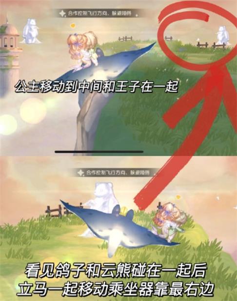 5.当看见左上角鸽子和云熊碰在一起后,立马一起移动乘坐器靠蕞右边