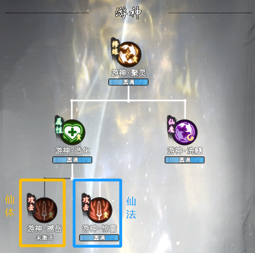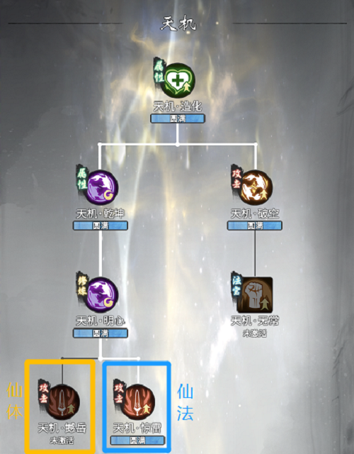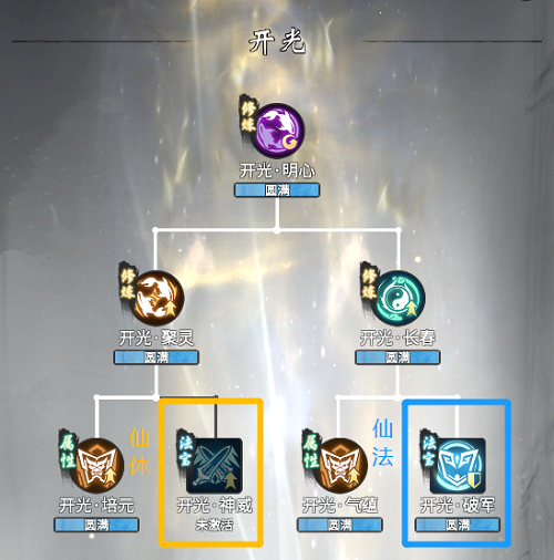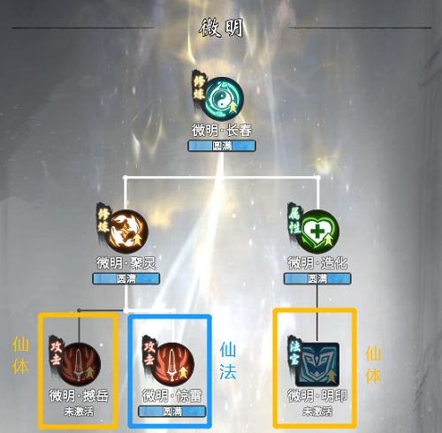 1、仙的心法路线为清灵、微明、开光、游神、飞玄、天机以及天玄,每个节点对应着仙魔修为。