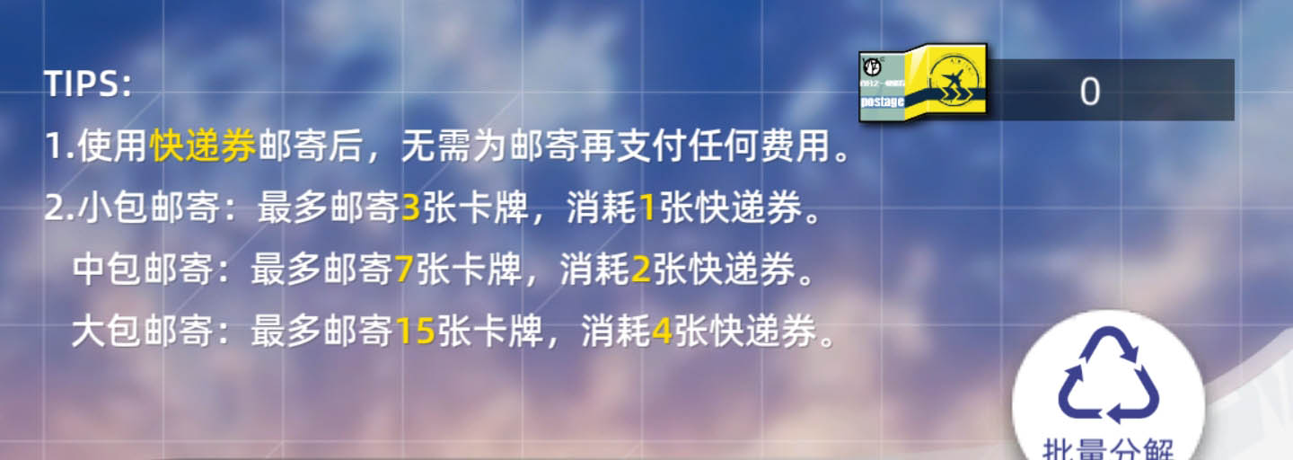 在游戏内,最低挡位的邮寄实体卡礼包要30块钱,一次可以邮寄三张,所以一张为10块钱。