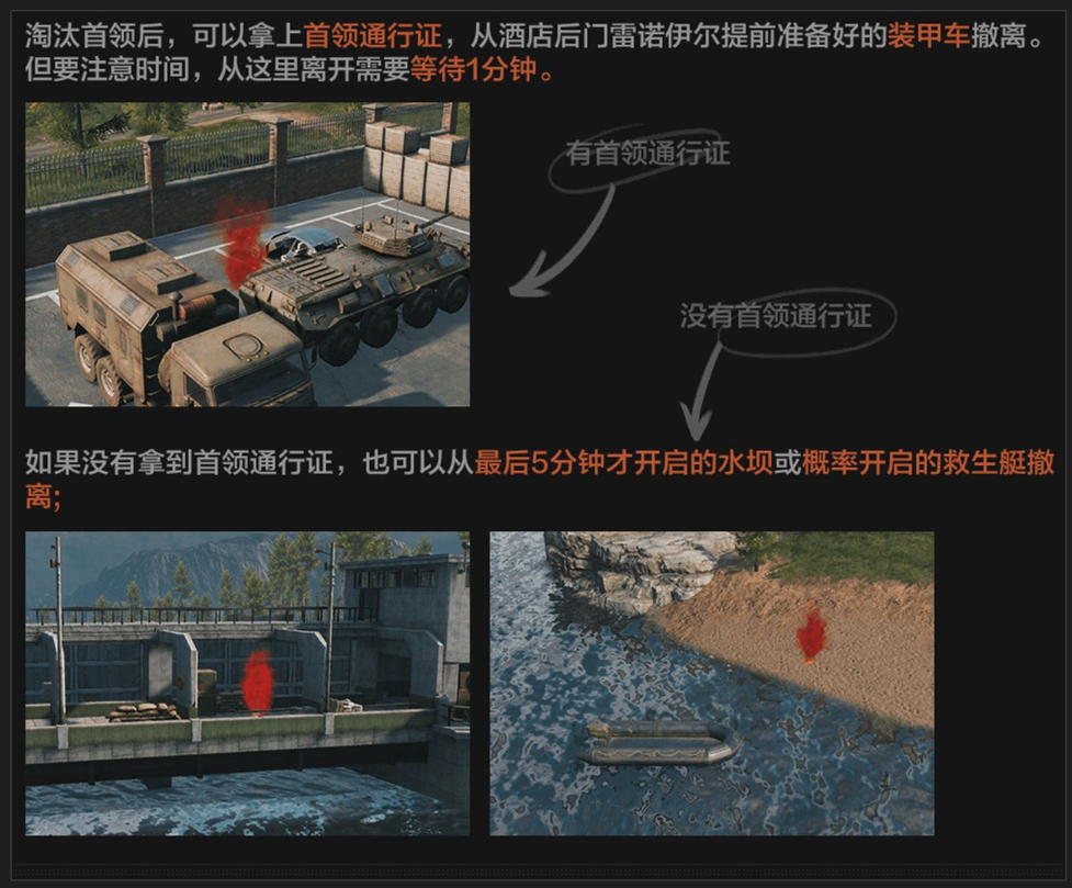 【“装甲车”撤离条件】需上交首领通行证,并在开启后60秒内在撤离体积里坚守10秒方可撤离,此撤离点可反复使用;
