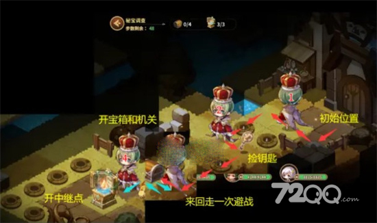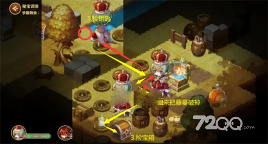 3.按红色路线捡取月亮钥匙,然后继续走直到开启稀有宝箱(这里会被地刺扣一次血。如果不想扣血,可以在被2个树桩夹住的第一格地刺处后退一格再向前走)