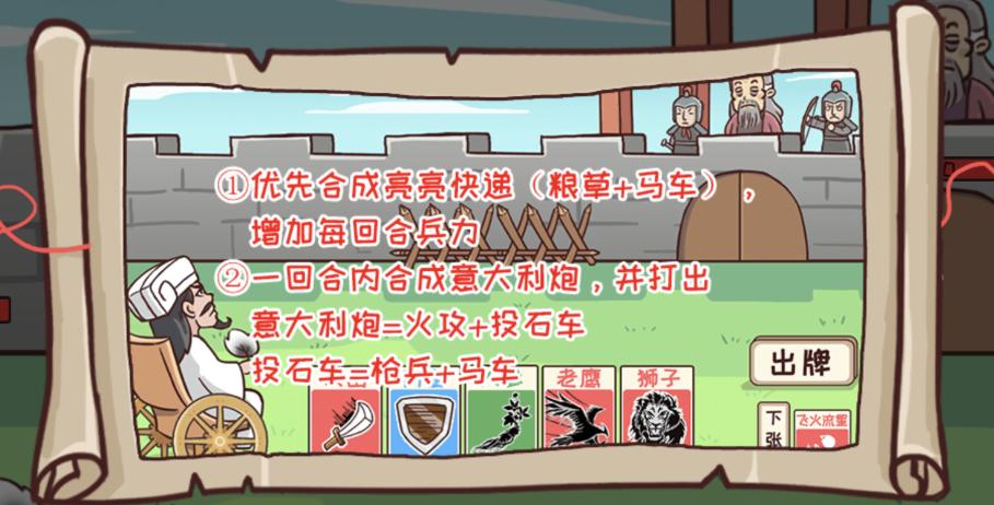 1、优先合成亮亮快递(粮草+马车),增加每回合兵力