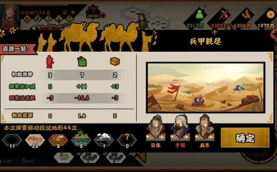 7.而兵甲,越多消耗粮草越多,那么赶路的时候必须很少,所以我最多会设置到4格,一般来说,马匪-1格,匈奴-3格,碰上匈奴基本没有保险进行探索了,所以我就设置的中间值,3格。