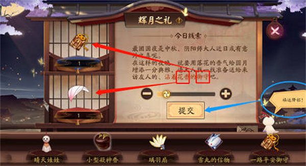 4:月神赐福,完成庭院签到获得线索,然后我们回到这里根据提示提交材料,每次需要提交两个道具才能获得福气值的;