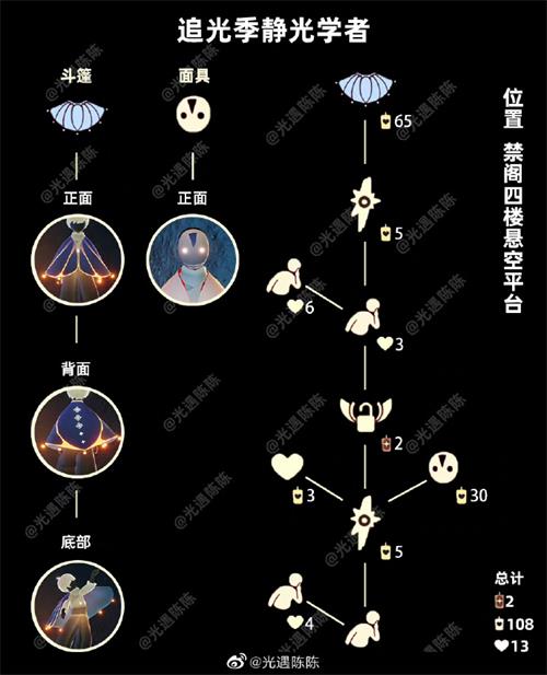 1.光遇静光学者兑换图如下,一共需要2个红蜡烛,108白蜡烛,13爱心