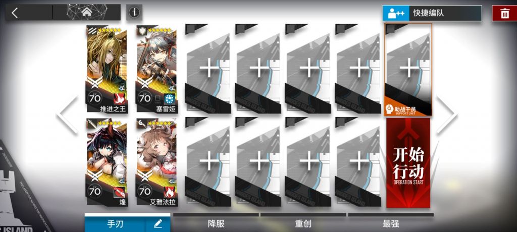 煌可以换成任意基石,推王可以换成银灰风笛等稍微手长一点的输出,小羊可以换成任意高台,塞雷娅可以换成任意奶盾,推荐多加奶或者输出