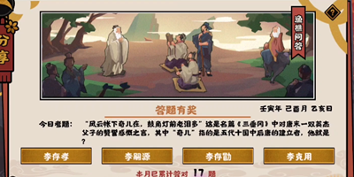 无悔华夏游戏中渔樵问答9月19日题目“风云帐下奇儿在,鼓角灯前老泪多”这是名篇三垂冈中对唐末一双英杰父子的赞誉感慨之言,其中“奇儿”指的是五代十国中后唐的建立者,他就是?答案就是李存勖。那么今天小编就给大家介绍一下无悔华夏渔樵问答9月19日答案分享,有需要的小伙伴不要错过了。