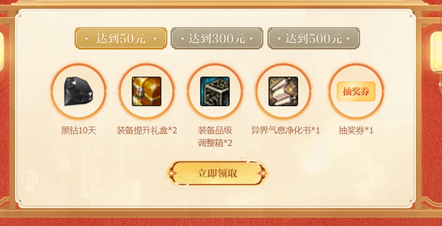 充值达到50元奖励:10天黑钻、2个装备提升礼盒、2个装备品级调整箱、1个异界气息净化书、1张抽奖券。