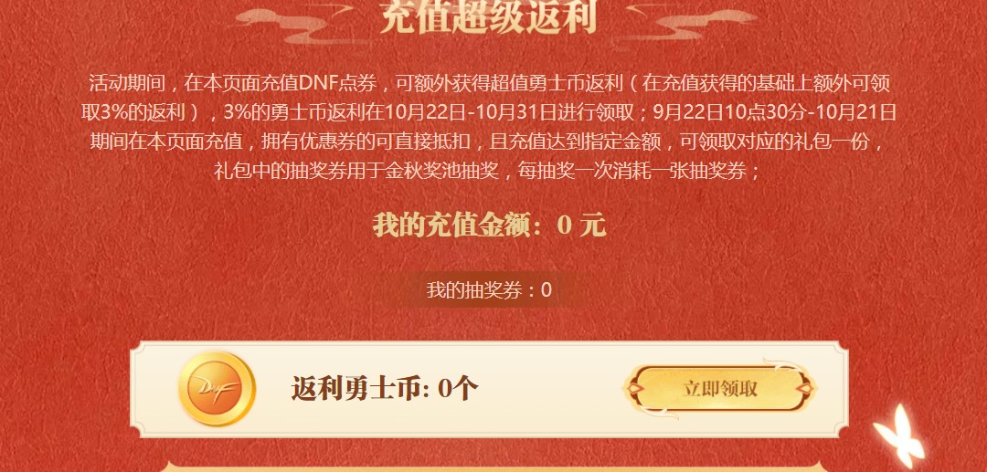 活动期间,在本页面充值DNF点券,可额外获得超值勇士币返利,在充值获得的基础上额外可领取3%的返利,3%的勇士币返利在10月22日至10月31日进行领取。