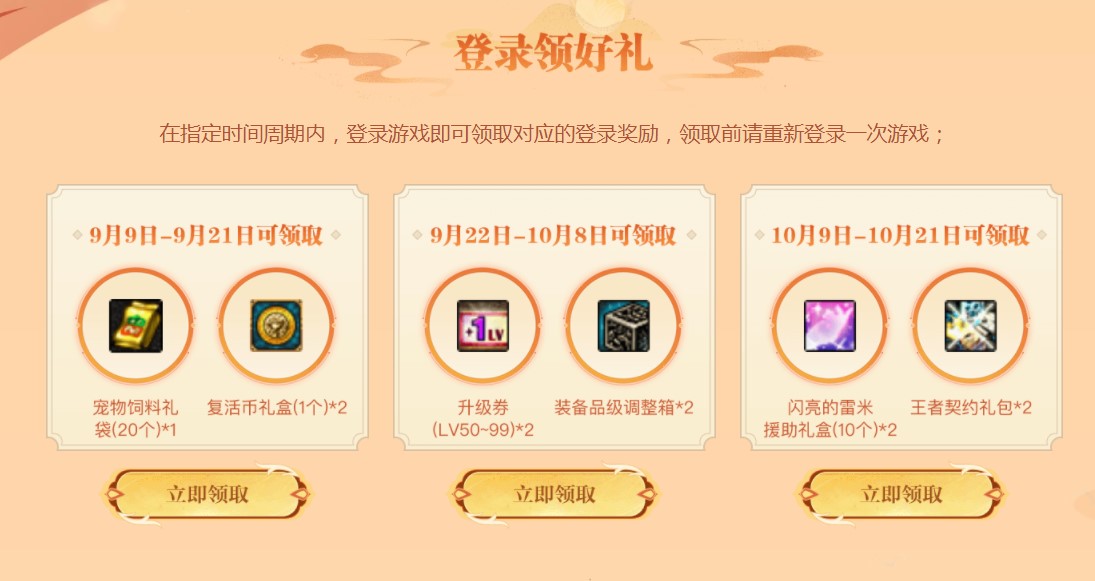 9月22日至10月8日领取2张50级至99级升级券、2个装备品级调整箱