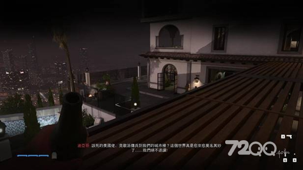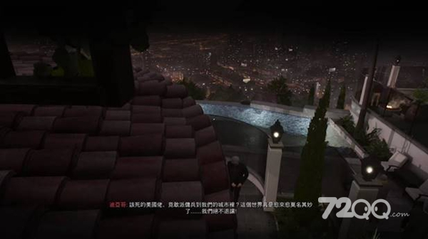 爬到走廊外的屋檐,扔瓶子引开泳池守卫。