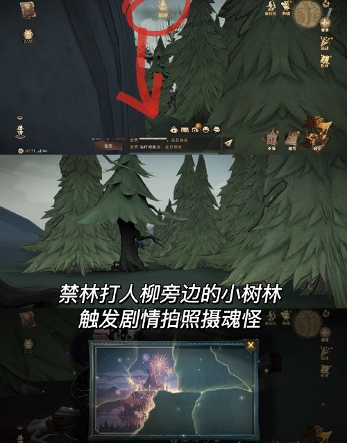 2、第三天拼图具体位置:禁林打人柳边上的小树林里,触发剧情,拍照摄魂怪。