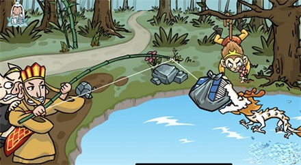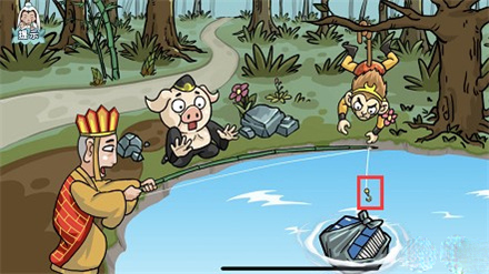 2、之后把钓鱼竿托给左侧的师父唐僧,然后点击鱼钩(注意是鱼钩,而不是唐僧),此时唐僧开始钓鱼(即钓经书);