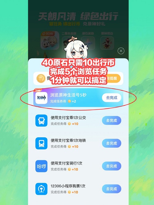原神游戏与支付宝联动活动在9月22日开启了,玩家们在支付宝活动界面即可领取40原石,兑换40原石只需要10个出行币,也就是完成5个浏览任务就可以了。那么今天小编就给大家介绍一下原神支付宝联动原石领取攻略,有需要的小伙伴不要错过了。