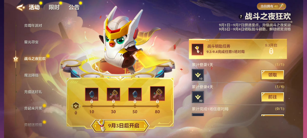 (2)9月3日-9月4日完成任意1场对局,领取“战斗钥匙”才可解锁领奖资格;