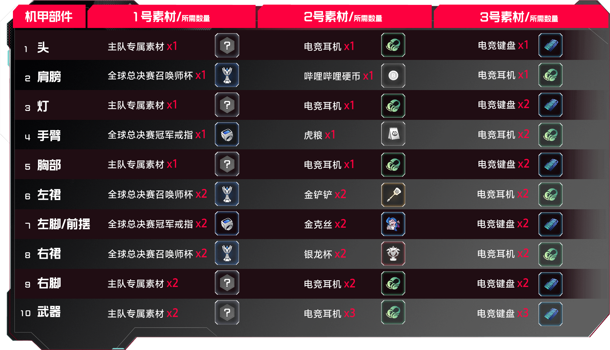 胸部:主队专属素材X1、电竞耳机×1、电竞键盘X2
