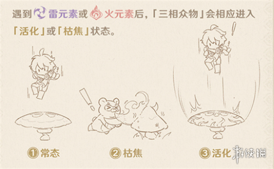 遇到己雷元素或火元素后, 「三相众物J会相应进入「活化」或「枯焦」状态。