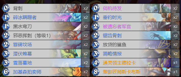 玩萨满的时候只要摸不到433换掉对手的德拉卡这个对局好像基本上打不过,可能Surrender吃了不少萨满上分。不过这个卡组还得是看胡,前期靠碎冰蹒跚者+被遗忘的军官+放贷的鲨鱼(最好是还有机会配合雪落墓地)刷一波数量足够多的硬币,中期配合加基森启动直接一把大刀怼脸一刀999,保险起见没砍死还可以用两个地标拉两个大的潜行生物场面叫杀,这个卡组其实如果前期就胡能搞来一堆硬币的时候不一定要强行配合加基森刷牌,直接趴住两个大潜行怪也能靠场面打残对手然后伺机靠邪恶挥刺斩杀。