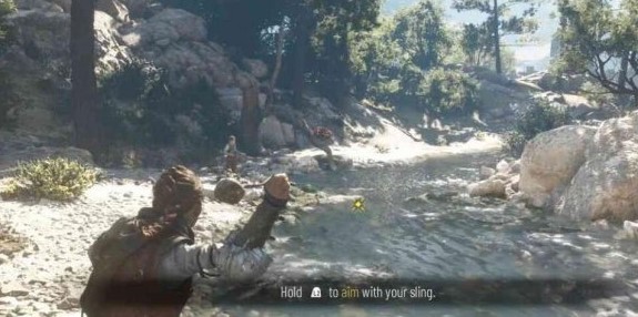 站在河流左侧的树枝后边,看准飘过来的松果,按住L2/R2键1~2秒,再按R2/RT射击。全部射中后进入过场动画,另一个男孩往河里扔了一块大石头,动画结束后跳杯。