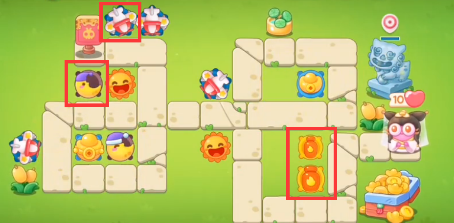 3、第三波,右上中间放元宝,中间下方放太阳。