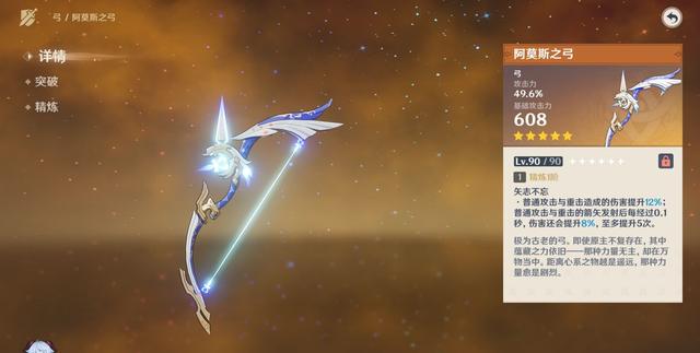 阿莫斯是攻击副属性,特效强化普攻重击,如果是融化甘雨,三层buff下的冬极弓,还是能接近阿莫斯伤害期望的,但是爆伤弓66%爆伤的飞雷弓则因为暴击低所以差了一截,阿莫斯之弓一箭暴击头,裸重击(两段加起来)5w5,比一般的武器高出不少伤害,大家没有更好的武器就用着。