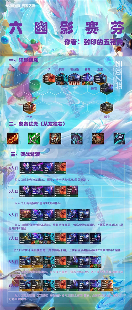 6幽影赛芬。最终阵容由慎、奥恩、塞拉斯、赛芬、亚索、锤石、巴德和派克组成6幽影4格斗2狂战1龙神1冒险。