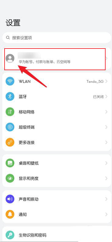 在设置中,点击【华为帐号头像】,如图所示: