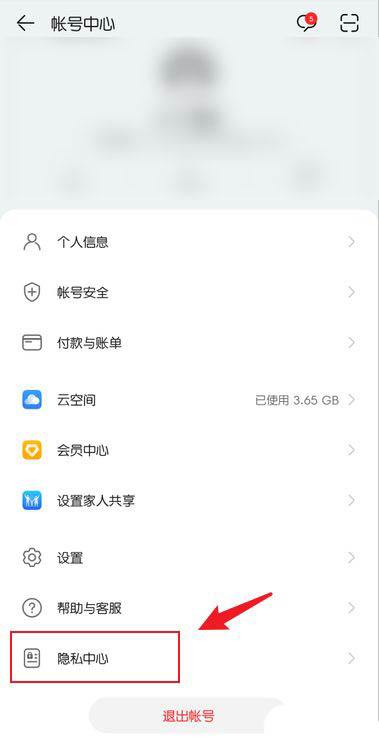 在帐号中心,点击【隐私中心】,如图所示: