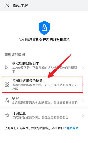 在隐私中心,点击【控制对您帐号的访问】,如图所示: