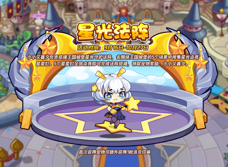 小小艾暮夕负责搭建王国城堡星光守护法阵,去围绕王国城堡的5个场景中搜集星光点亮星星灯。5个星星灯全部点亮即可完成法阵搭建,领取宠物奖励小小艾暮夕。