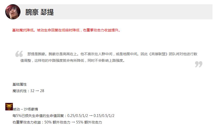 基础魔抗降低。被动生命回复在低级时降低,右重拳攻击力收益提升。