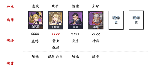 2、此阵容中的大师是用来增伤的,牛皋是用来提升我们生存能力的,剩下的两个R级别魂师大家随意选择即可。
