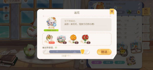 3:送花,同时我们也可以去通过送花的方式增加亲密度,可以去奥比雪山脚找到风儿扎花,同时也可以去使用星钻进行购买;