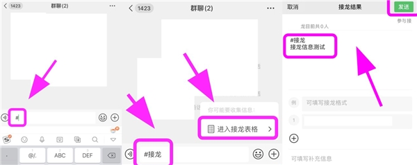 以上为大家整理的快速接龙办法小编为大家测试过了,所有想要接龙的友友们按照图文方式快速的编辑就可以开启需要的接龙格式,特别注意的是发送接龙信息之前可以提前输入自己的信息哦。