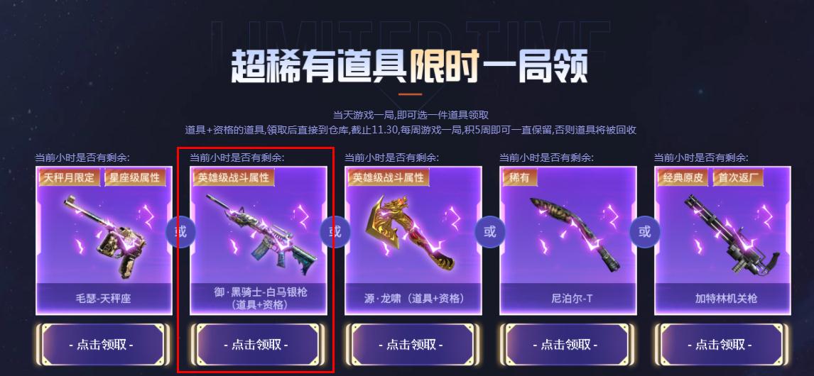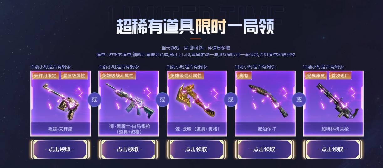 进入活动界面,移动到“超稀有道具限时一局领”栏目。玩家从10月1日起当天游戏一局,即可在以下五把武器中任选一把领取。