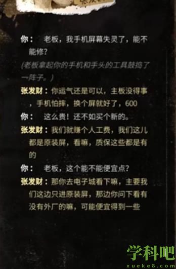 大多数修手机任务完成方法大多数这个游戏作为一个近期非常热门的模拟生活的一个游戏,游戏中除了不断的需要大家去找工作赚钱以外,还有很多的人物会触发一些新的任务内容,像是一些任务就需要大家完成才能继续进行主线。最近有些小伙伴们触发了一个修手机任务,这个任务其实就是让大家去修手机,但是作为一个非常苦逼的打工人,省吃俭用的生活着,在听到老板说要600块才能修的情况下大家肯定不能马上妥协,那么怎么办呢,这个任务怎么用最少的钱完成,下面小编就给大家带来大多数修手机任务完成方法。