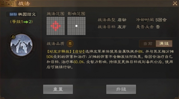 [对友方释放] [启动]选择友军单体使其全属性提升8%。并与其互相分摊50%受到的伤害和治疗:分摊的伤害不会触发任何效果。每回合治疗自己和目标,治疗率60.0%.受智力影响。持续至更换目标或刘备死亡后。使用后可继续行动。