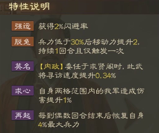 脱兔:兵力低于30%后移动力提升2,持续1回合且仅触发- ~次