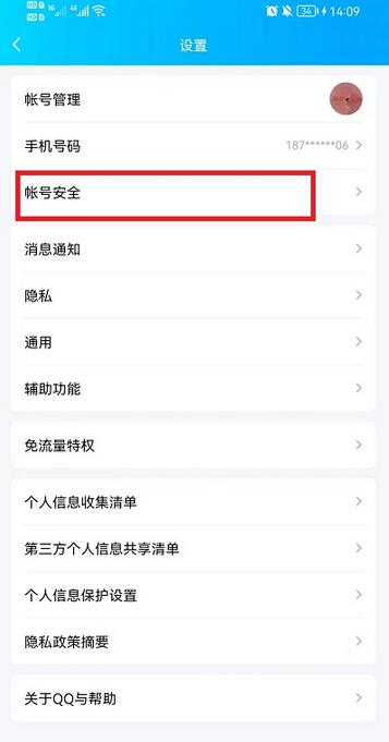 3、接着点击账号安全选项。