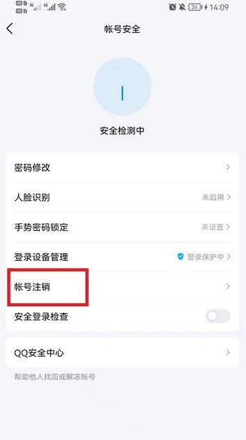 4、进入账号安全界面后,找到账号注销功能选项并点击进入。