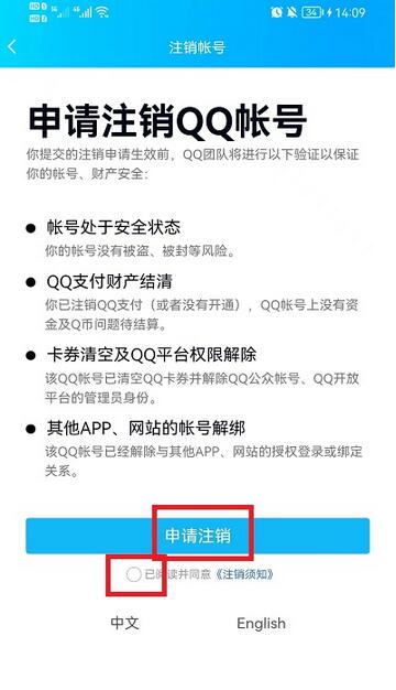 5、进入注销页面后,就能看到注销账号的各项条件,按要求完成后,勾选已阅读,再选择申请注销,就可以完成QQ账号的注销了。